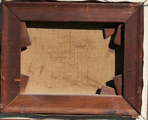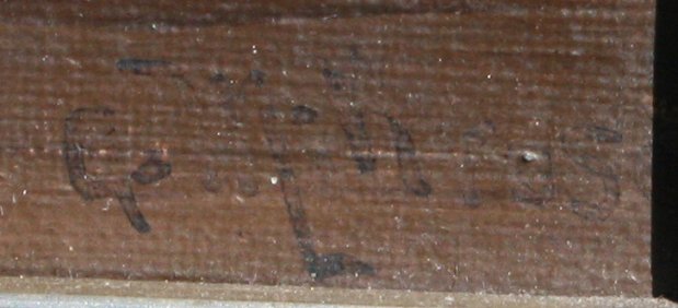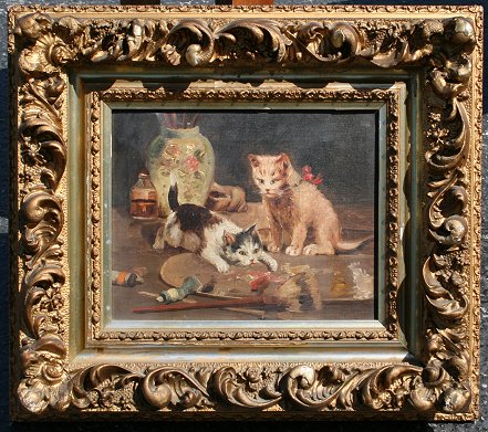 ILLEGIBLY SIGNED PAINTING OF KITTENS AT PLAY: Oil/Canvas, circa 1920, 8'' x 10'', illegibly signed G Millrose?, encased in over painted gilded gesso relief carved frame with wear and repair, 15 1/2'' x 17 1/2''.