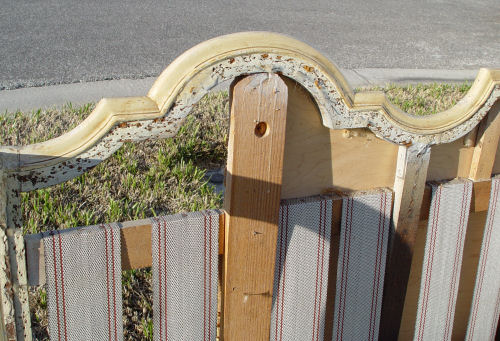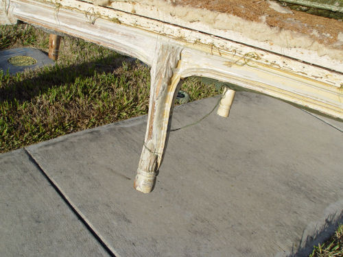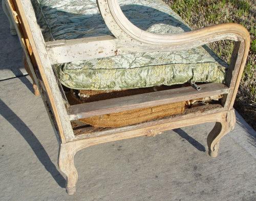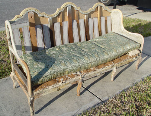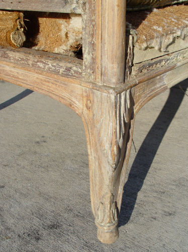 EARLY FRENCH LOUIS XVI STYLE SOFA FRAME: Worn painted finish, springs under cushion seat. 6 ft long x 39 1/2''h. x 29''.