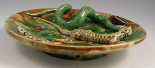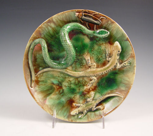 PALISSY TYPE MAJOLICA PLATE: Very life like lizard, snake and beetle. 9'' dia.