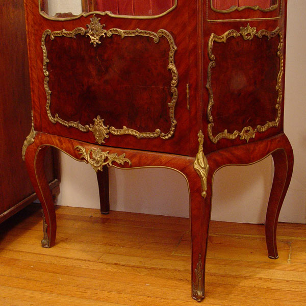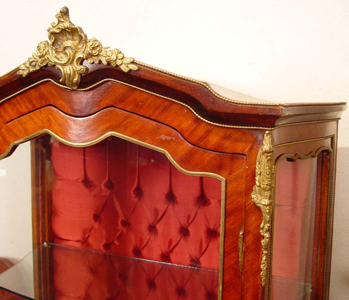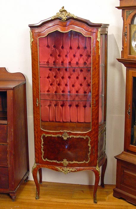 LOUIS XV STYLE FRENCH VITRINE: Ormolu mounted curio display cabinet, glass shelf interior with tufted fabric back, curved glass front and sides. Measures 73 1/2'' high x 26 1/2'' x 16 1/2''