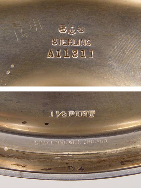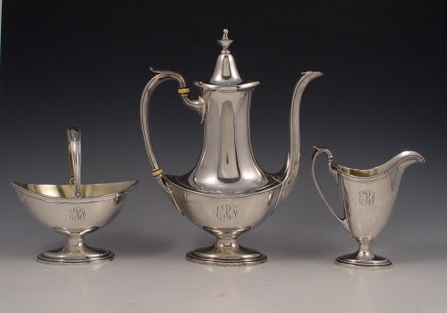 3 PIECE GORHAM STERLING TEA SET: To include 1) Petite teapot, measures 10'' x 8''. 2) open creamer, measures 5'' x 5''. 3) Open sugar with articulated handle, measures 4'' x 5 5/8''. Monogrammed. Retailed by Spaulding & Co. Chicago. Approx 23.8 troy oz.