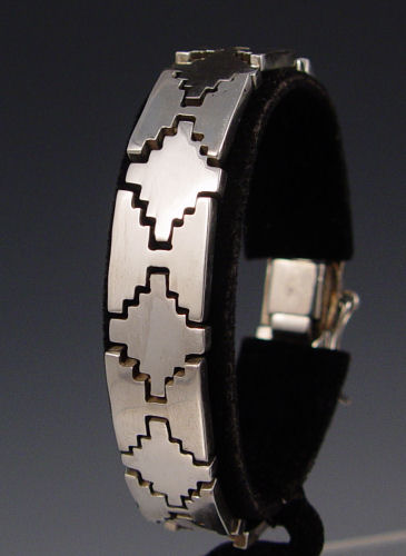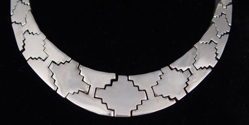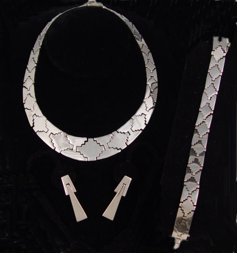 MEXICAN STERLING JEWELRY SUITE: Necklace, earrings and bracelet. All stamped Mexico 925. The necklace is about 7/8'' at the widest link and rests flat. Bracelet is 7 1/2' long, 1/2'' wide. The post earrings drop 1 5/8''. Approx. 7.16 troy oz.