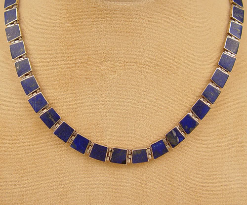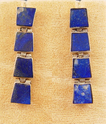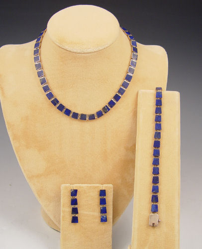 STERLING & LAPIS NECKLACE, BRACELET, EARRINGS: Links of lapis framed in sterling. Marked 970. The necklace lays flat 5'' dia., bracelet is 7 1/2'', post earrings are 1 1/2'' long.