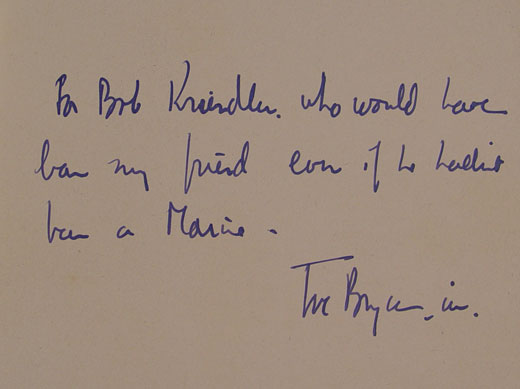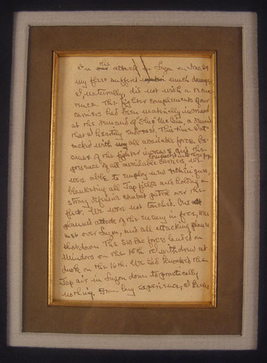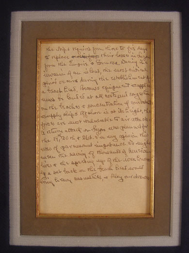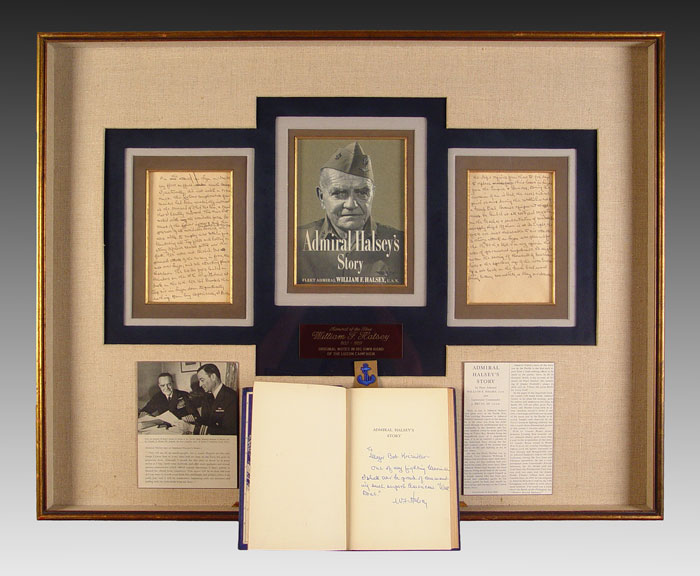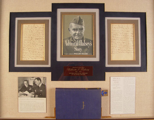 WILLIAM ''BULL'' HALSEY SIGNED FIRST EDITION BOOK & ORIGINAL NOTES: Signed first ''Admiral Halsey's Story'', signed by Halsey and J. Bryan III to Major Bob Kreidler. Halsey writes To Major Bob Kreidler, One of my fighting Marines. I shall ever be proud of commanding such superb Americans. ''Well Done''. Book comes with framed original 2 pages notes in Halsey's handwriting on the Battle of Luzon, photo of Halsey. Frame measures 28'' x 36 1/4''. Comes with original receipt from Leon H. Becker, dated 1981.