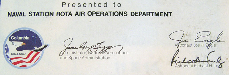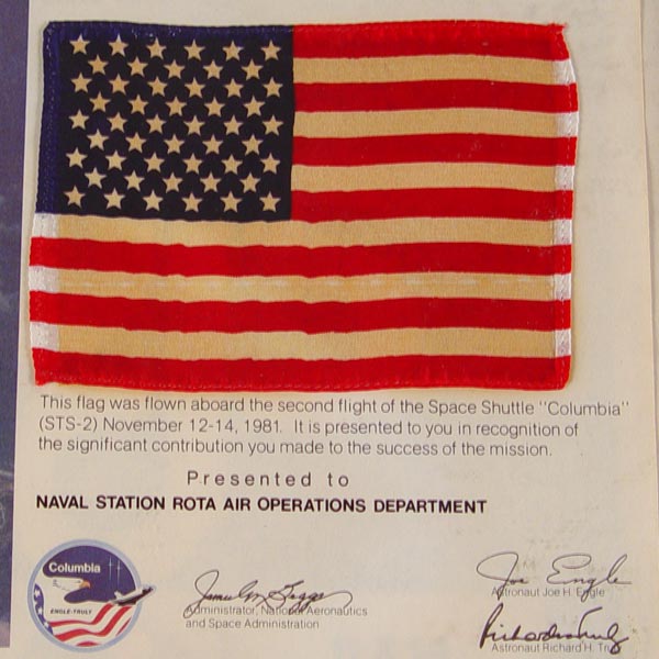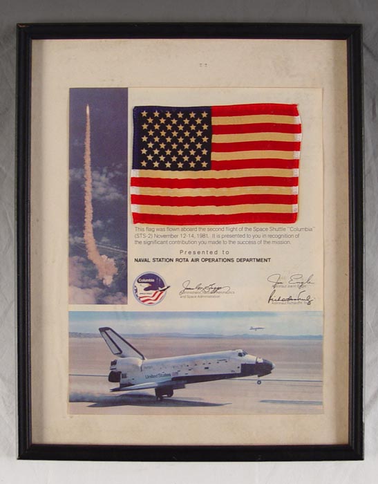 PRESENTED FLAG FLOWN ABOARD SPACE SHUTTLE COLUMBIA: Framed and mounted on paper, flag was flown aboard the 2nd flight of the Columbia (STS-2) and presented to the Naval Station ROTA Air Operations Department. Flag measures 4'' x 5 1/2'', frame measures 14 3/4'' x 11 3/4''.