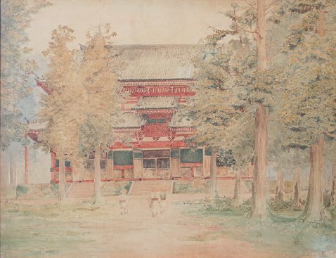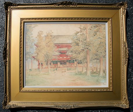 BUNSAI IOKI, (Japanese, 1863-1906): Kioto Temple, Water Color, sight size 18 3/4'' x 25'', signed and titled lower right, encased in painted gesso frame, 32'' x 38''.