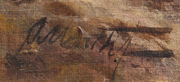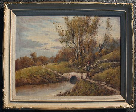 HUNGARIAN? LANDSCAPE WITH SHEPHERDESS AND FLOCK OF SHEEP: OIL/Canvas mounted to board, 22'' x 31'', illegibly signed lower right, encased in carved and painted frame with minor, 30'' x 38''.