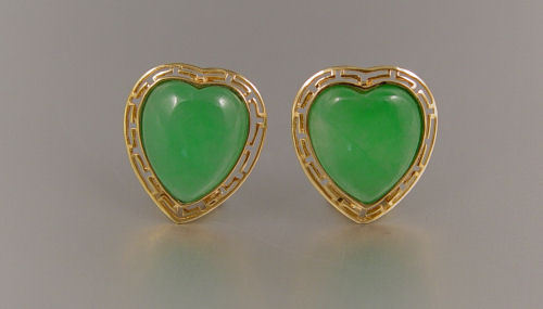 HEART SHAPE JADEITE EARRINGS: 14K yellow gold framed heart cabochon cut jadeite. The gold in a reticulated design. Post and hinged clip closure. 5/8'' in size.