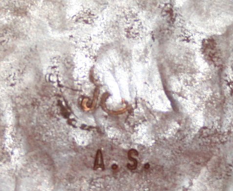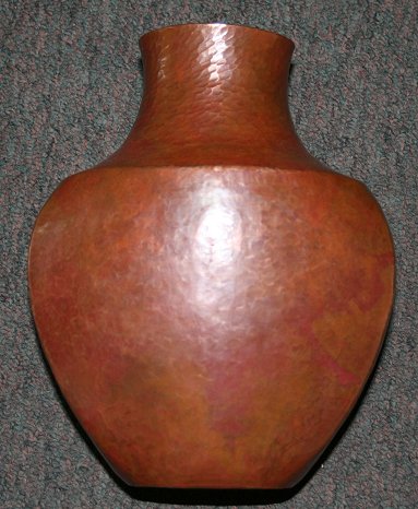 SIGNED HAND HAMMERED ARTS & CRAFTS COPPER VASE: 8'' h. x 6'' w., stamped A.S., illegible marking in center.