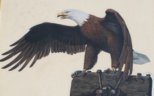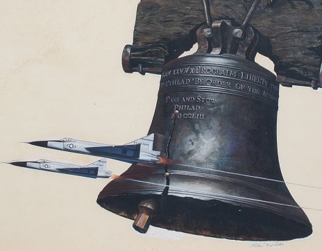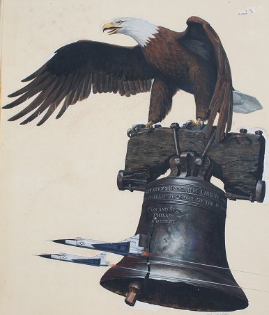 WICKS, Ren, (American, 1911-1977): Illustration depicting the American Bald Eagle, Pass & Stow Liberty Bell & 2 American fighter jets, Gouache, sight size 23 1/2'' x 19 1/2'', signed lower right, encased in contemporary carved and gilded frame, 28 1/2'' x 25''.
