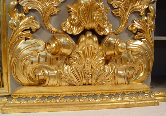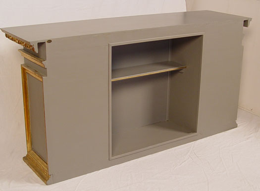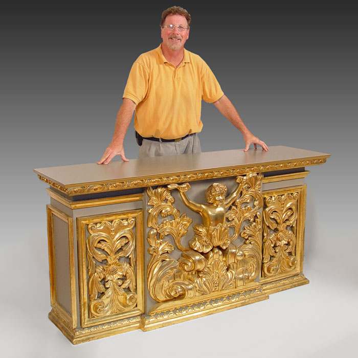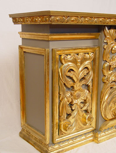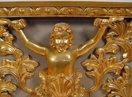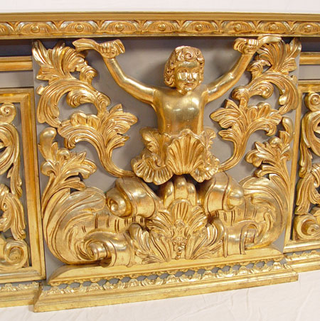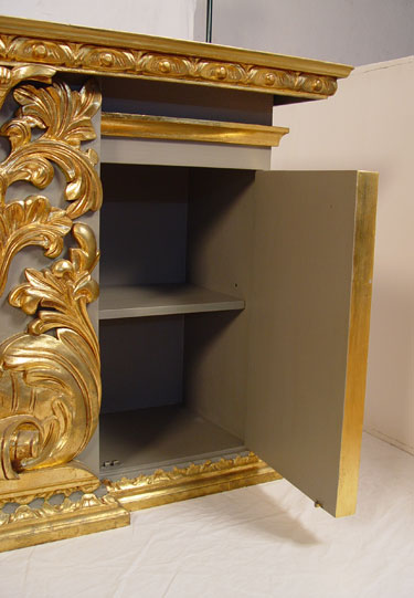 ITALIAN GILT CHERUB DECORATED SIDE CABINET: Sideboard or bar cabinet, back with open shelf storage. Measures 35 1/2'' high x 71'' x 19 3/4''