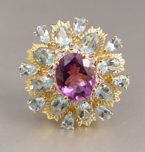 14K AQUAMARINE, AMETHYST AND DIAMOND RING: In the very style of Buccellati this 14K yellow gold ring centers an oval shaped mixed cut amethyst, approx. 3.00 Ct., nestled with a generous showing of 16 pear and oval shaped mixed cut aquamarine. The stones measure approx. 5.00 x 3.0 mm and 6.00 x 4.00 mm. The 8 diamonds frame the amethyst, 8 round single cut diamonds, approx. .10 Ct. The diamonds average VS in clarity and G-H in color. All gemstones are prong set. Size 7.25. Weight: 9.6 grams.
