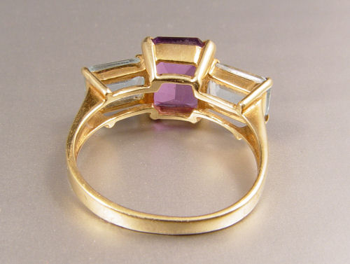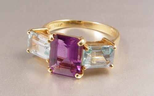 2.5 CT AMETHYST WITH BLUE TOPAZ RING: 14K yellow gold ring centers an emerald cut amethyst. Weight: 2.50 Ct. Approx. The amethyst is flanked by 2 emerald cut topaz. Weight: 2.50 Ct. Approx. The gemstones are prong set. Weight: 3.5 grams. Size: 7