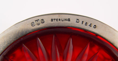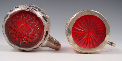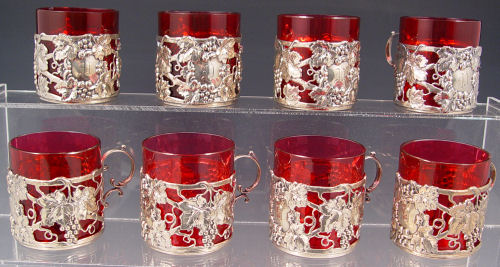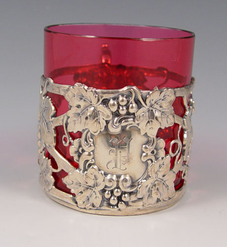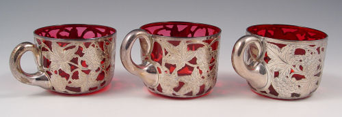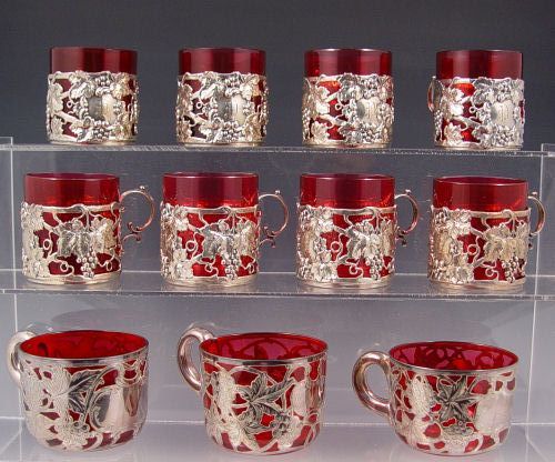 SET OF 8 GORHAM AND 3 ALVIN STERLING SILVER OVERLAY CRANBERRY GLASS PUNCH CUPS: The three Alvin cups match the punch bowl at Lot 1, 999 fine silver overlay in a grape design, no monogram, 2 7/8'' dia., 2 1/8''h. The eight Gorham punch cups are also in a grape design, the cranberry glass inserts are removable, the sterling is monogrammed, 2 5/8''h., 2 3/8'' dia.