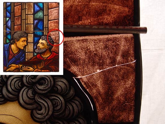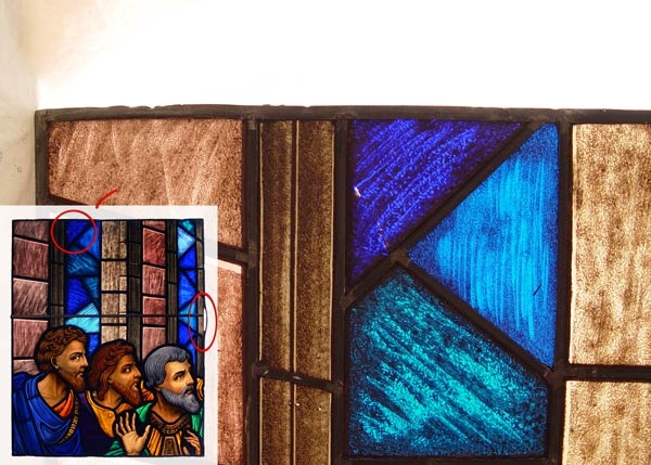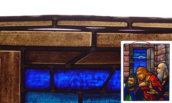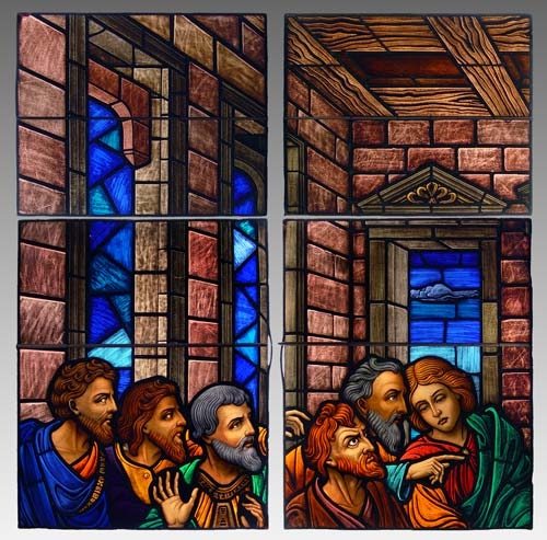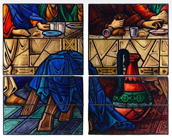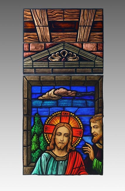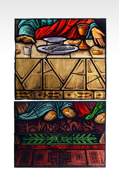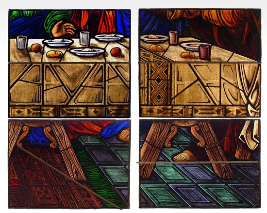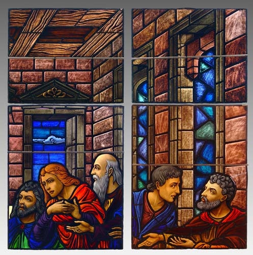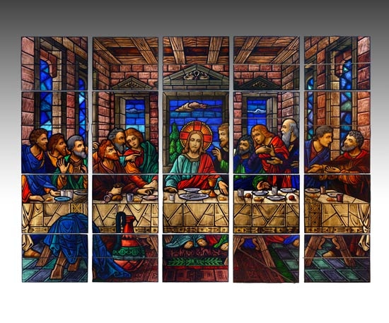 10 FT TALL STAINED GLASS ''THE LAST SUPPER'': Comprised of 5 panels, each approx. 120'' x 32''. KJ Mueller of Zephyrhills FL. brought these windows from the Mueller Studio in Germany. Karl J. Mueller is responsible for many historical church windows in Florida and is a direct descendant from Mueller Studios of Germany. Call for condition.