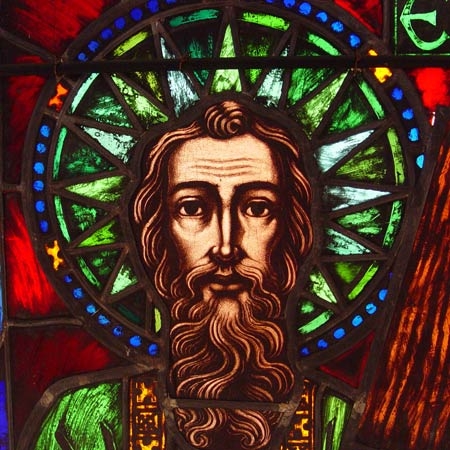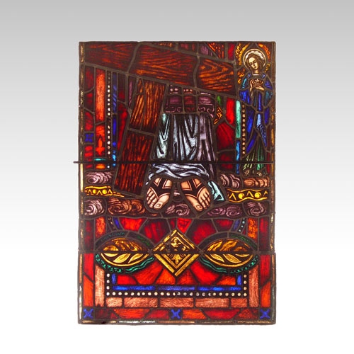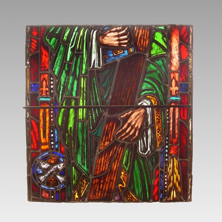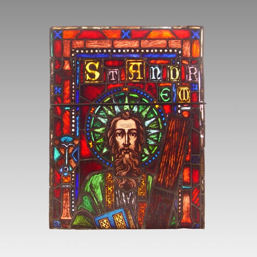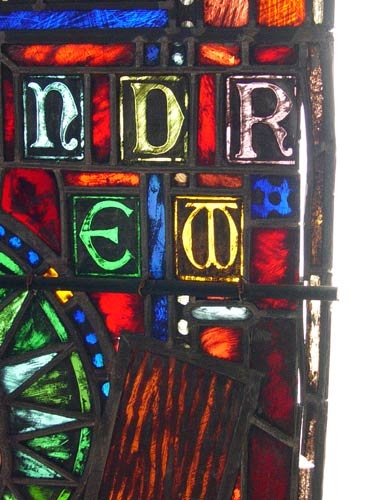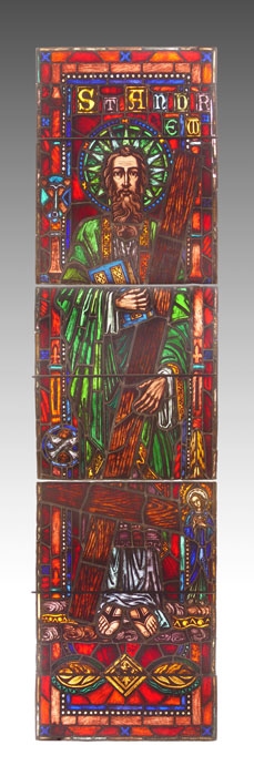 KARL MUELLER STAINED GLASS CHURCH WINDOW ST. ANDREW: Approx. 120'' x 32''. KJ Mueller of Zephyrhills FL. brought these windows from the Mueller Studio in Germany. Karl J. Mueller is responsible for many historical church windows in Florida and is a direct descendant from Mueller Studios of Germany. Call for condition.