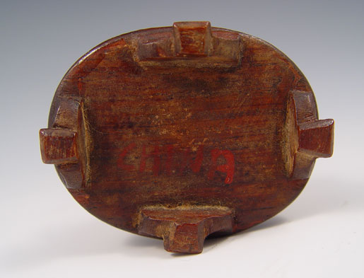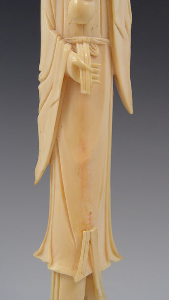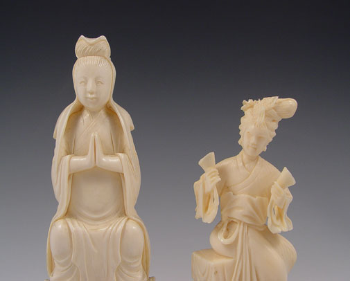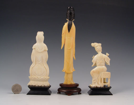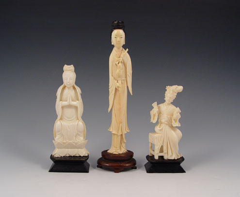 3 CHINESE CARVED IVORY FIGURES: To include 1) Woman holding fruit, black painted hair. Figure measures 7 1/4'' high, on wood stand 8 1/4'' high overall. Note discoloration on back. 2) Woman in crouched praying position. Figure measures 5'' high, on wood stand 5 3/4'' high overall. 3) Man seated, measures 4'' high, on wood stand 4 3/4'' high overall.