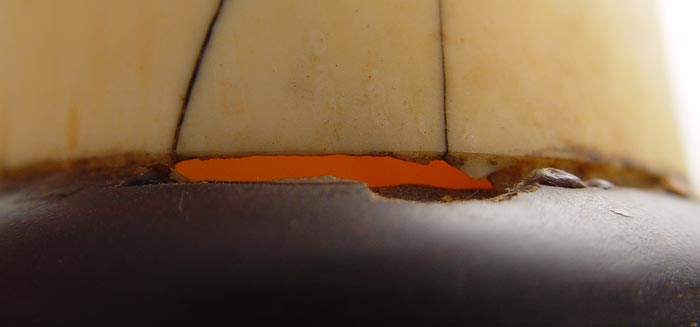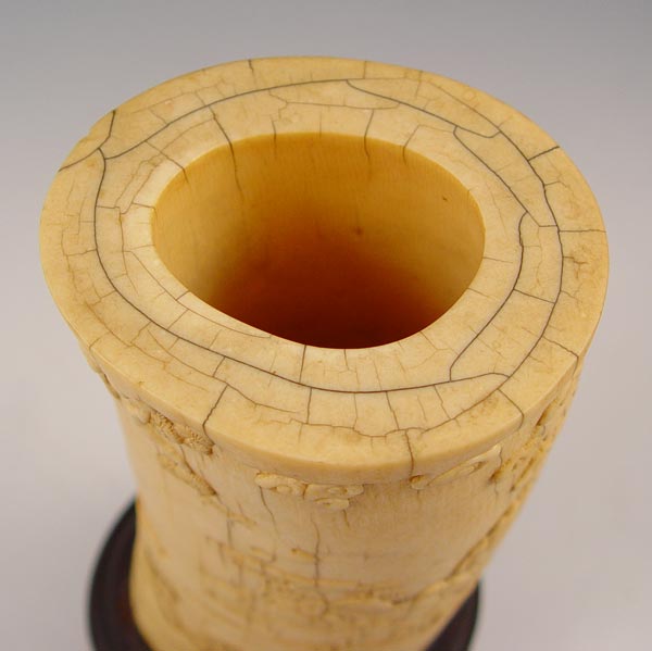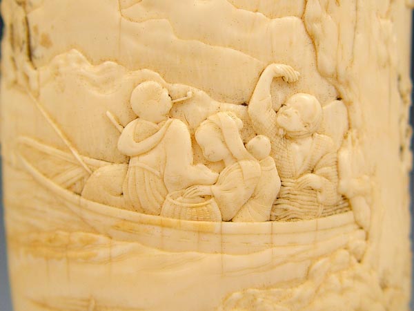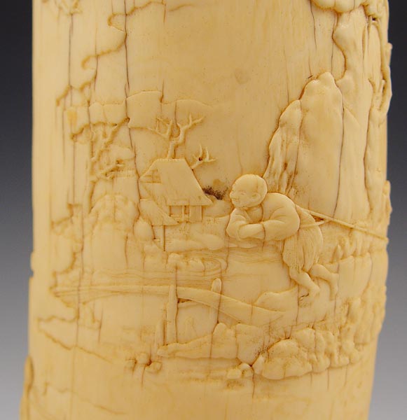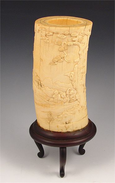 CHINESE CARVED IVORY TUSK: Carved with scene of 2 men pulling boat along stream. Tusk measures 7 1/4'' high, affixed to footed wooden base, 10 3/4'' high overall x 4 3/4'' oval dia.