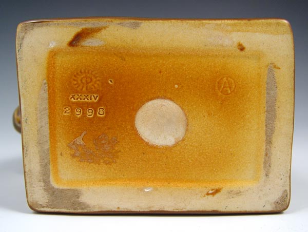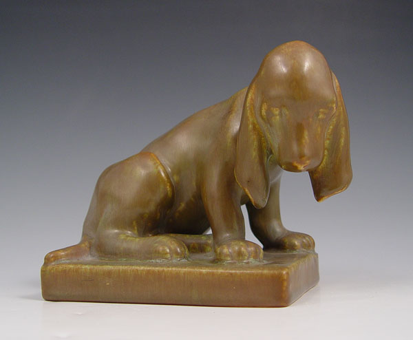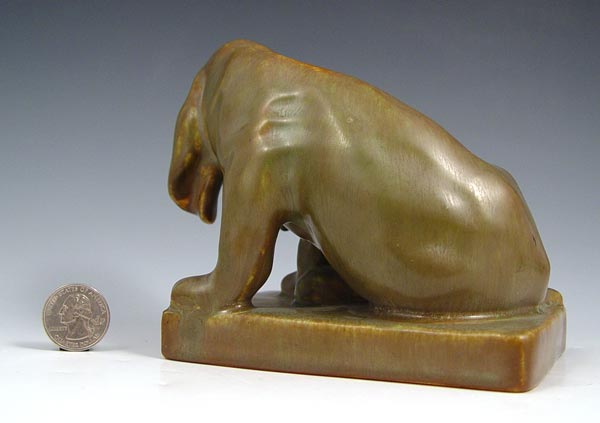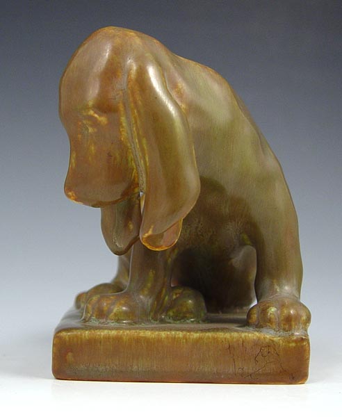 1934 ROOKWOOD POTTERY HOUND DOG FIGURAL BOOKEND: Single bookend, #2998. Measures 5'' high x 6'' x 3 3/4''. No chips or cracks.
