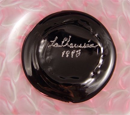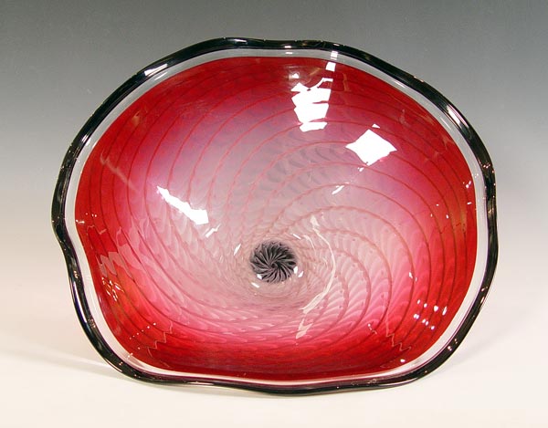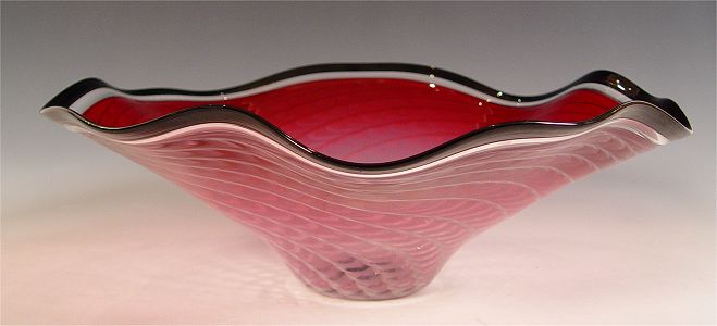 CONTEMPORARY SIGNED FRENCH ART GLASS BOWL: Cranberry with opalescent swirls. Signed La Charissie? 1998 on base. Measures 7'' high x 19 1/2'' dia.