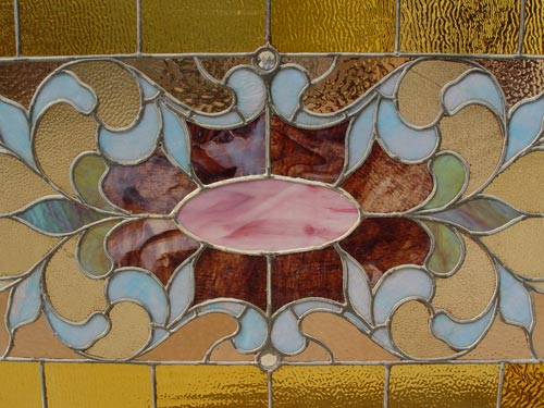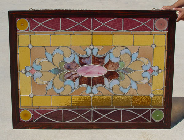 LARGE STAINED GLASS WINDOW: Wood framed panel utilizing textured, opaque and faceted glass in amber, pink, purple and blue. Glass alone measures 25'' x 47''. With the frame it is 40'' x 52'' overall.
