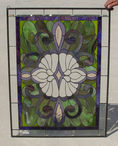 STAINED GLASS PANEL: Metal framed, soldered loops for hanging. In purple, green and beveled clear glass. Glass measures 27'' x 37''.