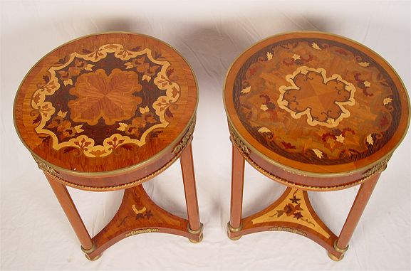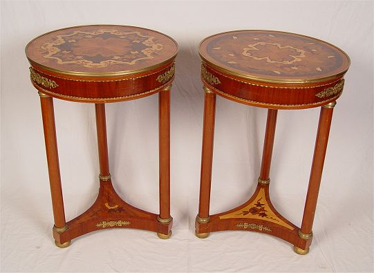 PAIR MARQUETRY INLAY SIDE TABLES: Each with a different design to the round tops. Match in form and ormolu design, columnar legs, bun feet. Mid to late 20th C. 31 1/2''h., 21 3/4'' dia.