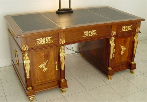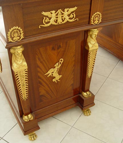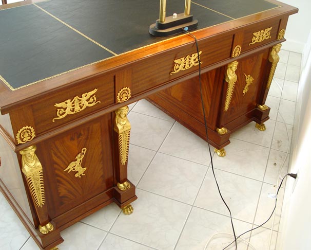 HIGHLY ORNATE EGYPTIAN REVIVAL STYLE DESK AND CHAIR: Applied masquerons, angels with trumpets, and metal paw feet. Late 20th C. The double pedestal desk separates into 3 sections for transport. Measures 31'' high x 63'' x 32 3/4''.