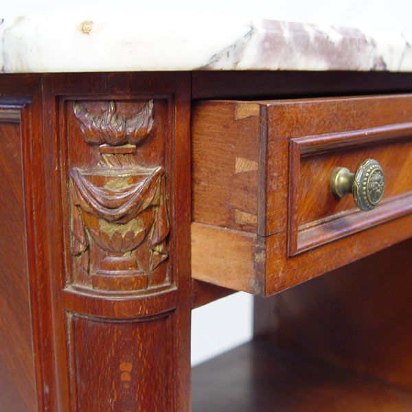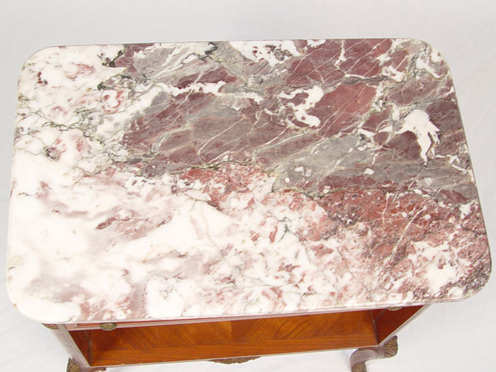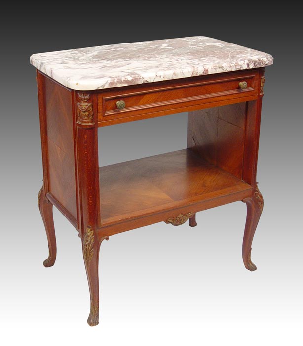 FIRST HALF OF 20TH C FRENCH MARBLE TOP STAND: Walnut, one full length drawer over an open shelf. Marble with rounded corners. 29''h. x 25 1/2'' x 16 1/2''.