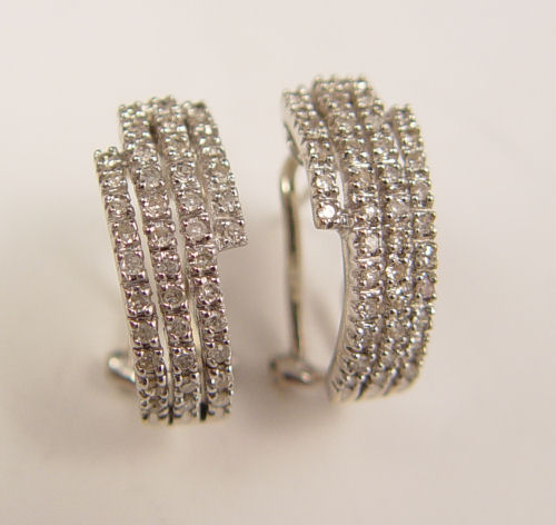 14K DIAMOND HUGGIE EARRINGS: 14K white gold earrings contain 80 round single cut diamonds. Approx. weight .50 Ct., average SI-I1 in clarity and I-J color. The diamonds are prong set. Post and hinged clip closures. Weight 3.6 grams