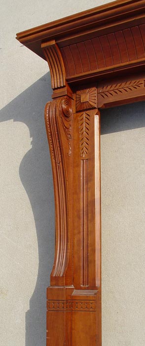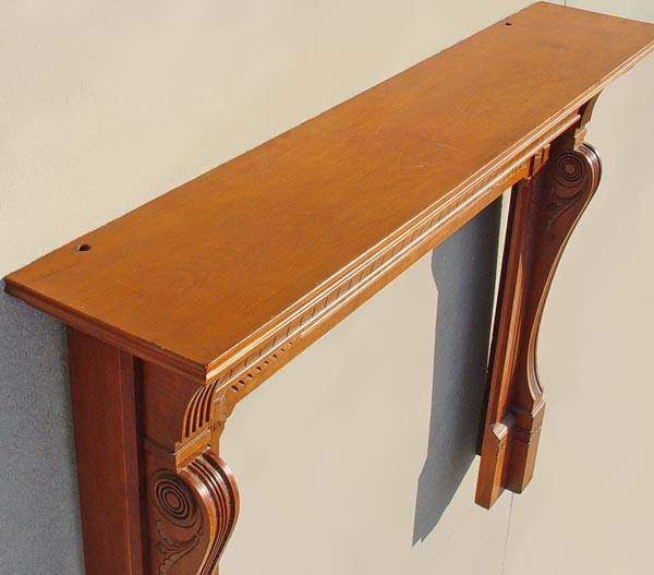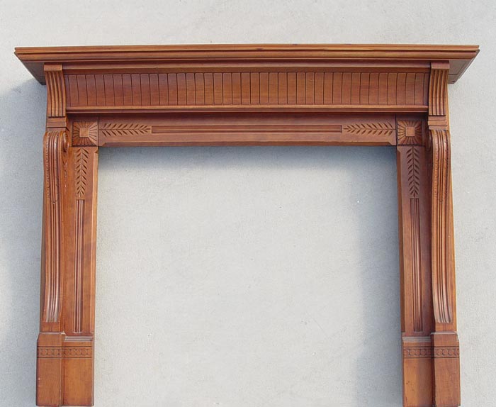 CARVED CHERRY FIREPLACE MANTLE: 48''H. x 52'' x 12'', the hearth opening is 38'' x 40''.