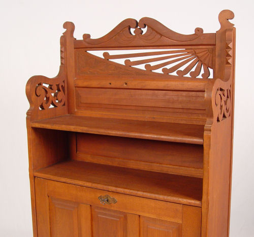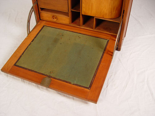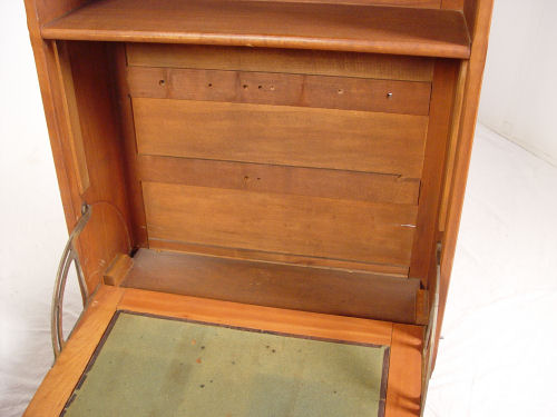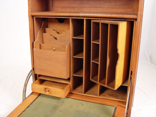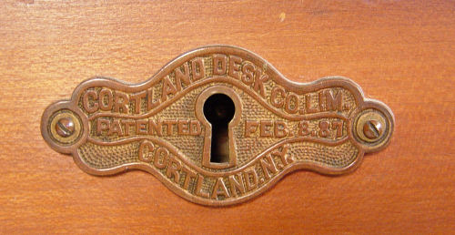 CORTLAND DESK CO WALL DESK: Fall front desk with versatile interior of letter boxes and cubicles. 45 1/2'' tall x 25 1/2'' x 9''. Cortland Desk Co., Cortland, New York.