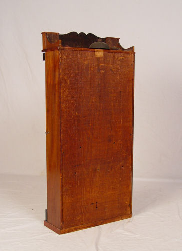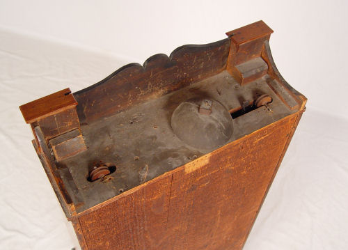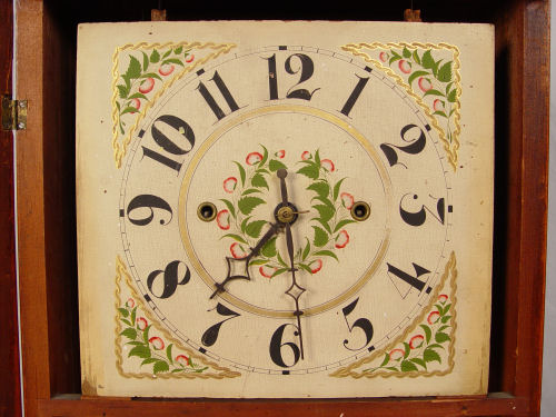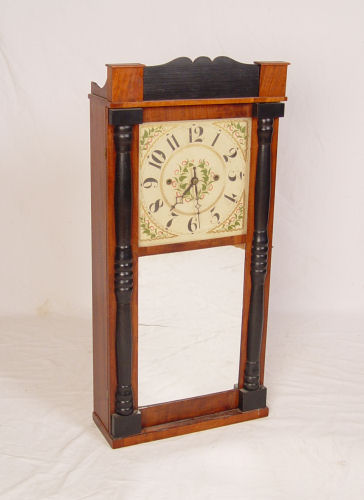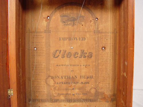 19th CENTURY JONATHAN BURR WALL CLOCK: Circa early to mid 19th century, hand painted wood face with Arabic numerals and floral designs. Half columns front, mirror lower section. Original bell on top. Original Jonathan Burr label interior. Key, pendulum, double weight movement. Missing key, pendulum needs repair, possible replacement weights. Measures 35'' high x 16 1/2'' x 5 3/4''.