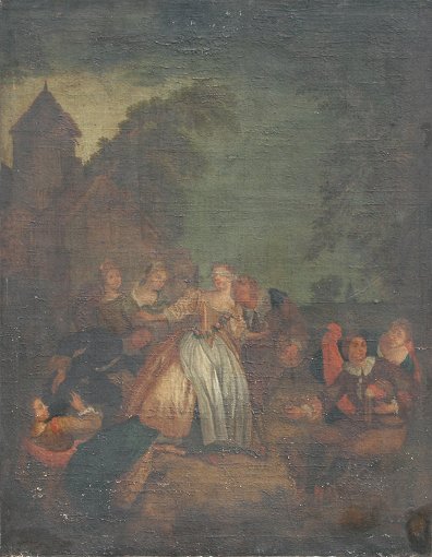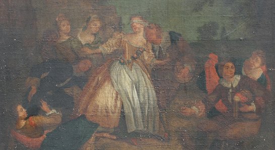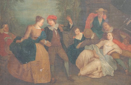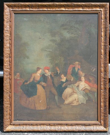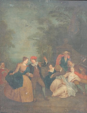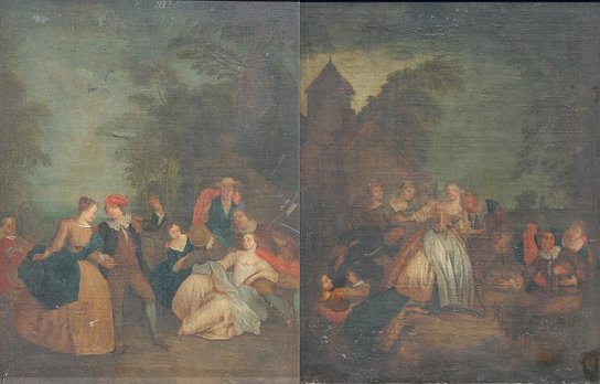 PAIR OF EARLY OIL PAINTINGS AFTER PIETER ANGELLIS: Oil/Canvas, 33'' x 26'' each, Blind Man's Bluff and a Dancing Frolicking Fete, encased in carved and gilded frames with minor wear, 39'' x 31 1/2''.