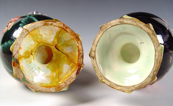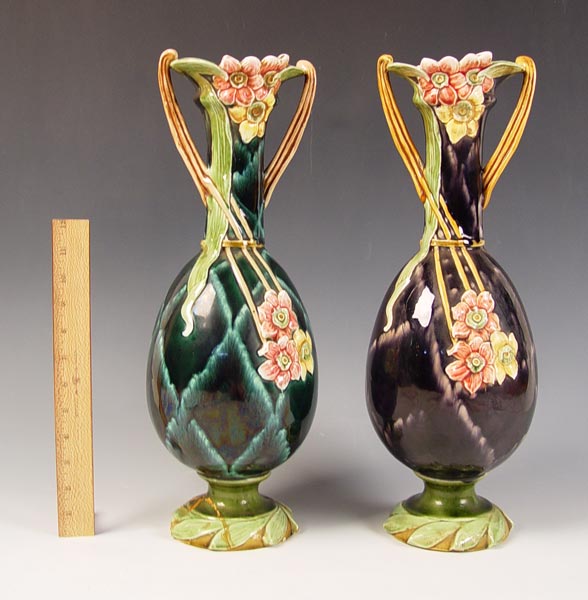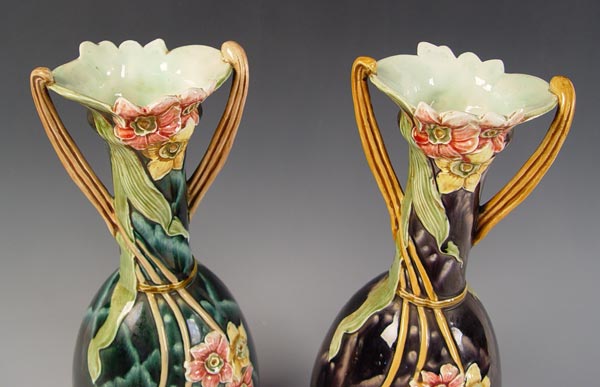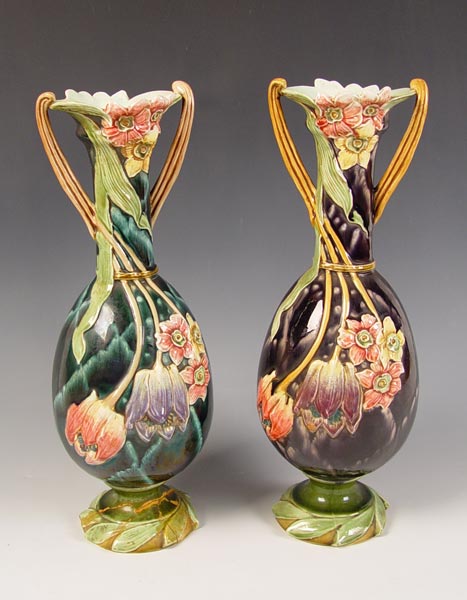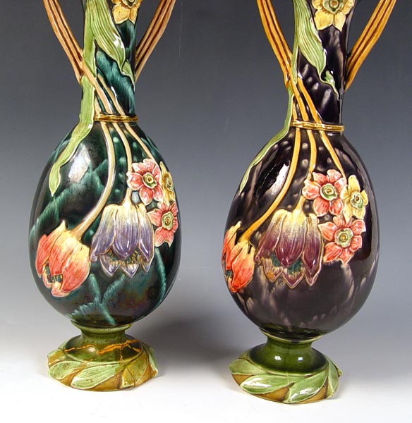 FRENCH MAJOLICA VASE: Art Nouveau floral design, Sold with a matching vase with repair to base.