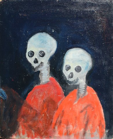 NAIVE / SURREAL OIL/BOARD PAINTING OF SKELETAL FIGURES CLAD IN RED ROBES: No visible signature, 23 3/4'' x 20'', unframed.