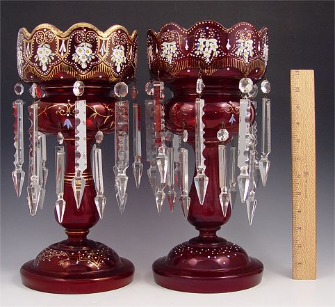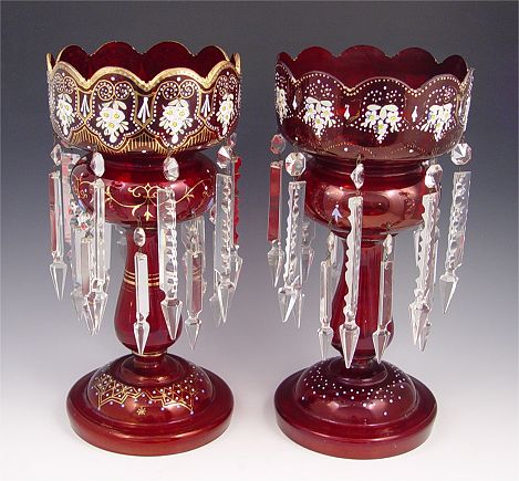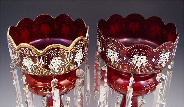 PAIR ENAMEL DECORATED RUBY GLASS LUSTERS: Crystal prisms. Note the gold has been worn off of one (curious). Measure 14'' high x 7'' top dia.