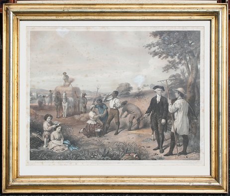 GEORGE WASHINGTON WITH SERVANTS STEEL ENGRAVING: Sight size 19'' x 24 1/2'', gilded frame with wear, 26'' x 31''.