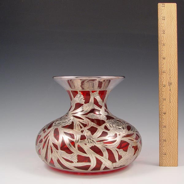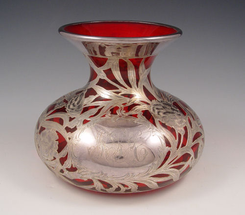 ALVIN STERLING SILVER OVERLAY CRANBERRY CARAFE OR VASE: 999 fine silver overlay in a floral design, monogram, 6 3/4'' h. 8'' dia. at the widest.
