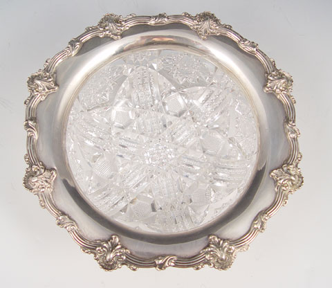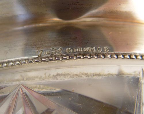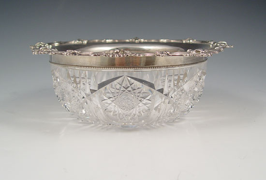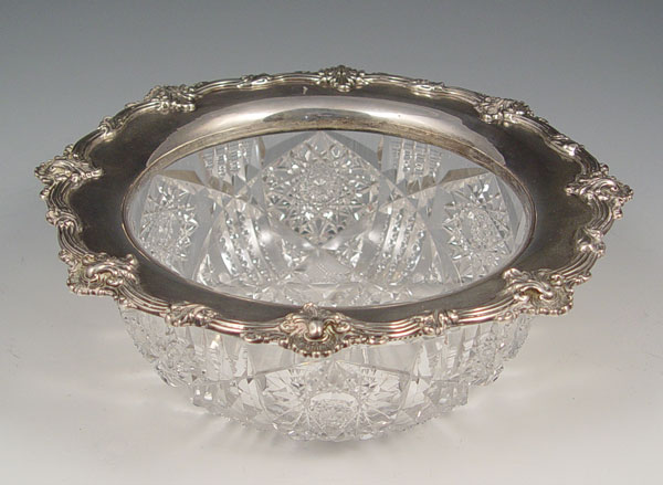 STERLING RIM BRILLIANT PERIOD CUT GLASS BOWL: Sterling mounted cut glass centerbowl. Illegible hallmark, appears to be Redlich & Co.. Measures 3 1/2'' high x 8 1/4'' dia.