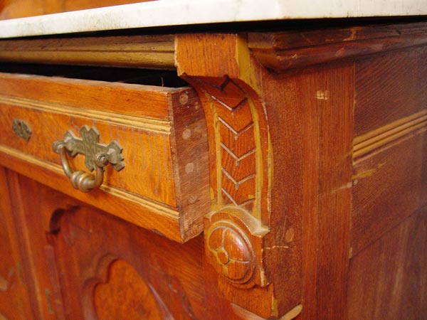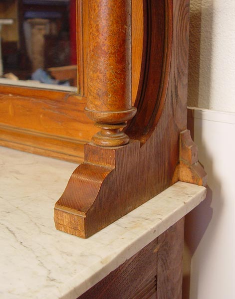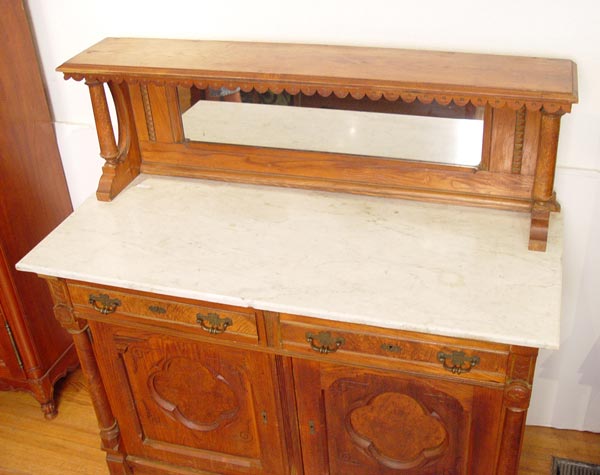 VICTORIAN MARBLE TOP SIDEBOARD: Mirror backsplash under scalloped top shelf. Two half length drawers over doors. Measures 53 3/4'' high x 54 1/4'' x 23''