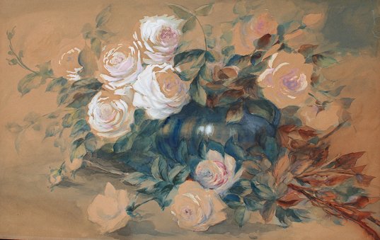 EARLY 20TH C QUALITY STILL LIFE PAINTING OF ROSES: Watercolor on Board, 16'' x 24 3/4'', no visible signature, encased in period gilded and carved frame with wear, 22'' x 30 1/2''.