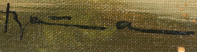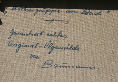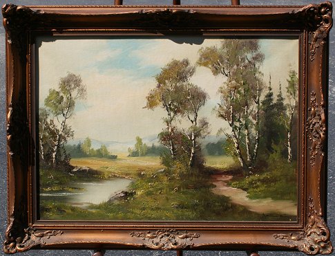 BAUMANN, (European, 20th C): River scene with birch trees, OIL/Canvas, 20'' x 27 1/2'', signed lower right, signed and titled verso, German carved and gilded frame, 26'' x 33''.