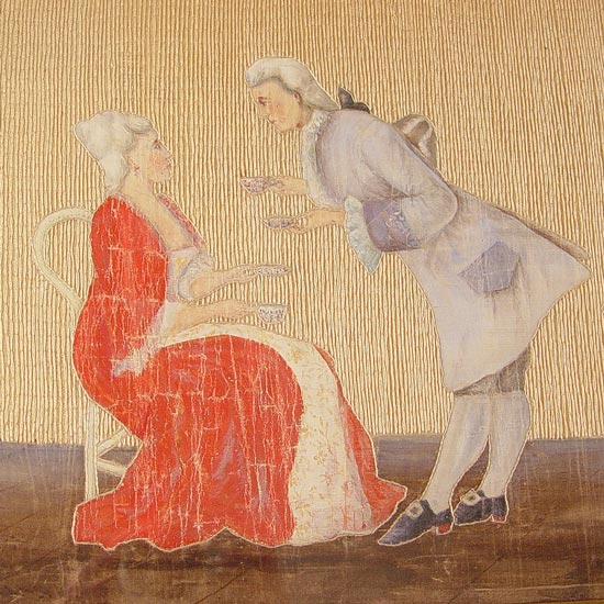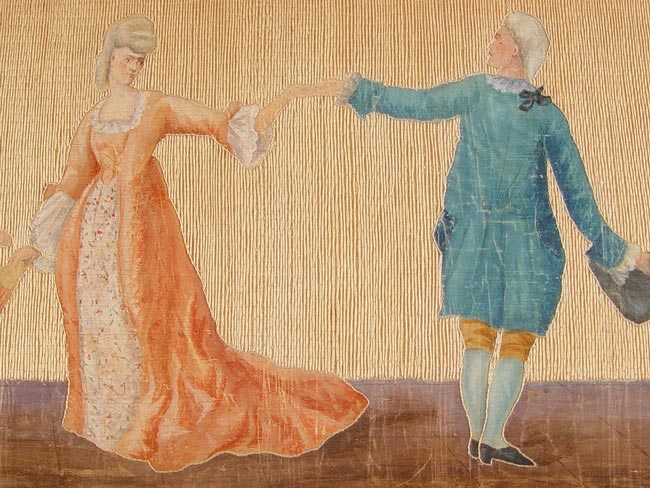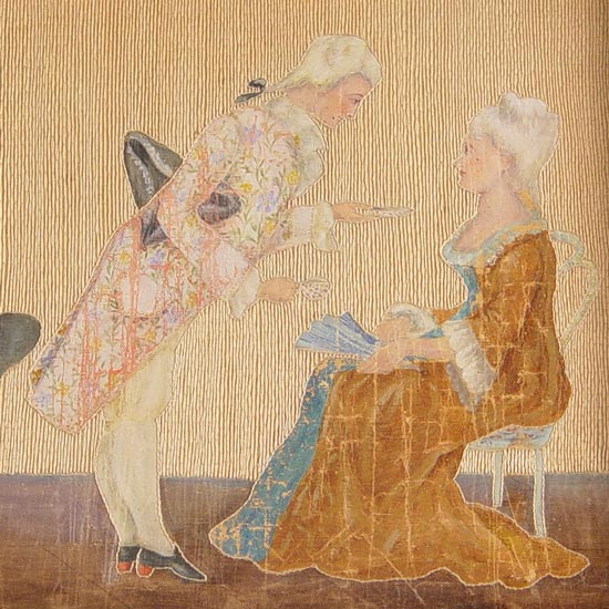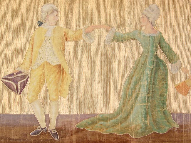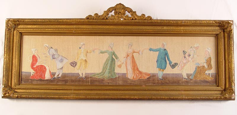 PRINGLE, Mary Ann McLean (Canadian Mid 19th C): Painting on silk. Verso statement hand written ''Mary Ann McLean Pringle: A Canadian artist active mid 19th C. St. Thomas Ontario Painted this panel and her daughter Agnes Pringle Wallace did the embroidery in silk''. Dated 1840. Framed under glass, 18'' x 51''.