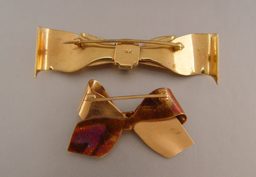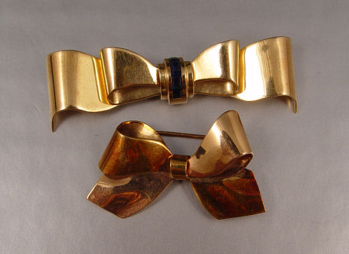 TWO 14K GOLD RIBBON PINS: 1) Signed Krementz, 14K bow pin measures approx. 1 1/2'' in width. Bar pin closure. Approx. 6.5 grams. 2) 14K yellow gold bow pin contains 4 blue sapphires of unknown origin. Width: Approx. 2 1/4'' Bar pin closure. Approx. 11.4 grams.