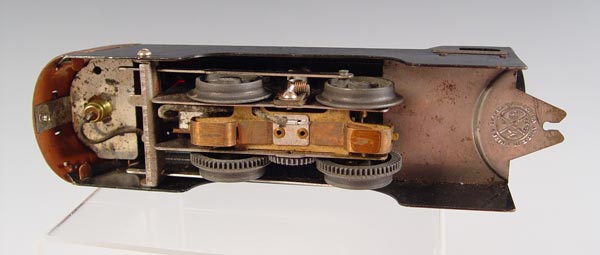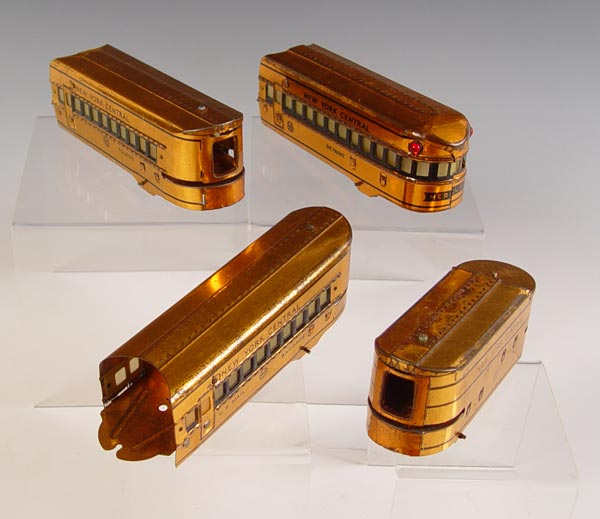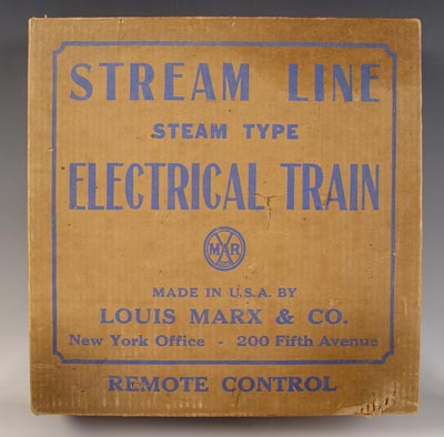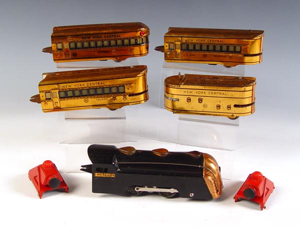 MARX STREAM LINE TRAIN SET IN BOX: Copper toned Mercury engine New York Central Lines, 3 passenger cars and caboose. set also comes with 2 bumpers for track, no track included. Comes in original box, No. 7096. Box measures 3 3/4'' high x 14 3/4'' x 14 3/4''.