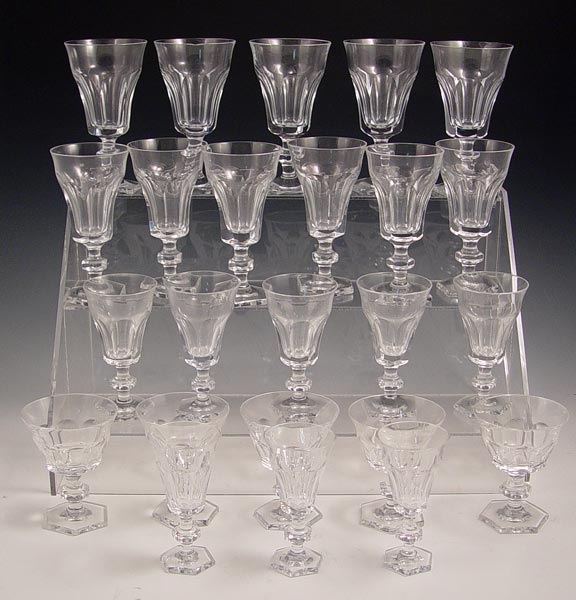 BACCARAT QUALITY CRYSTAL STEMWARE: 21 pieces to include 11 wine stems (5 1/4''), 5 wine (4 5/8''), 3 cordials (4''), and 5 cocktail (3 3/4''). The undeciphered acid etched mark may be a Baccarat mark.