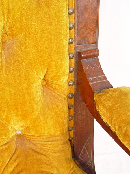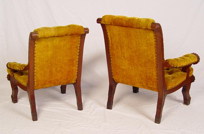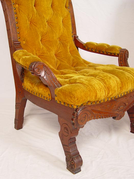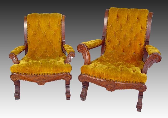 PAIR RENAISSANCE REVIVAL VICTORIAN PERIOD SLIPPER CHAIRS: Tufted velvet upholstery on incised and walnut frames. 31''H. X 27'' X 22''.