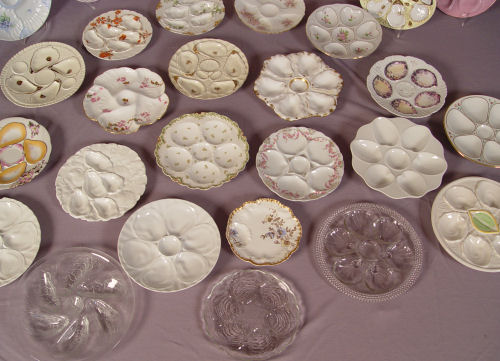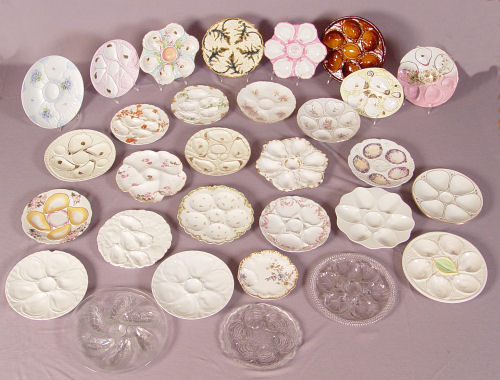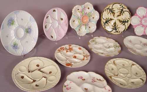 IMPORTANT 30 PC ESTATE COLLECTION OYSTER PLATES: A collection of approx. 30 oyster plates- 5 French Limoges, 3 glass, a few earthenware, and a couple contemporary. Most are unmarked as to maker.