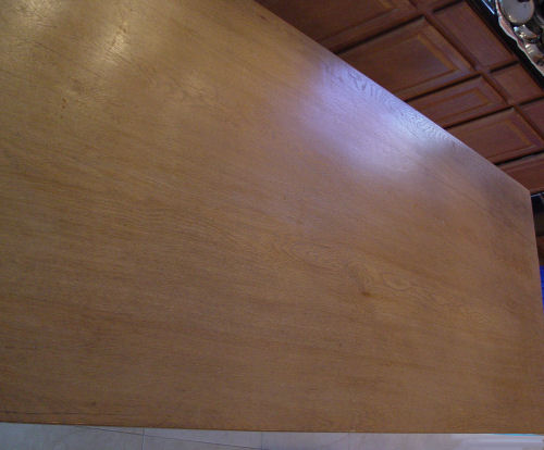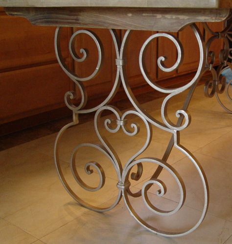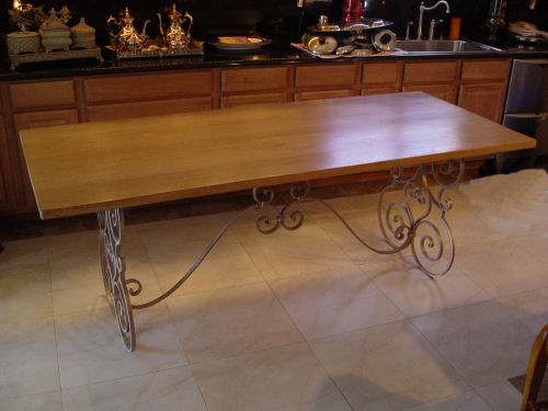 WROUGHT IRON BASE 7' LONG TABLE: 7 FT polished wood top over scrolled iron base. The base with painted finish. 31 1/4'' tall x 7' x 35'' wide.